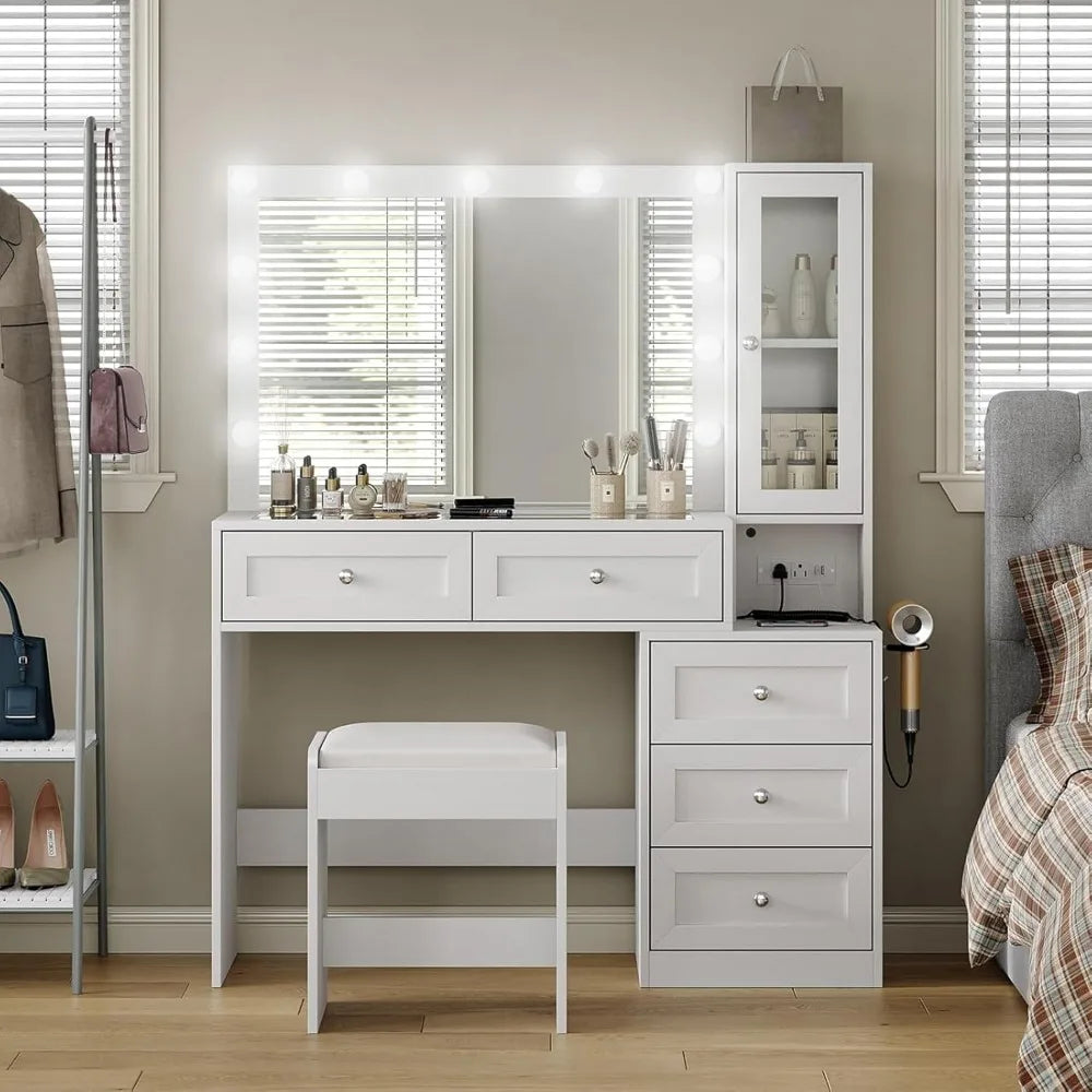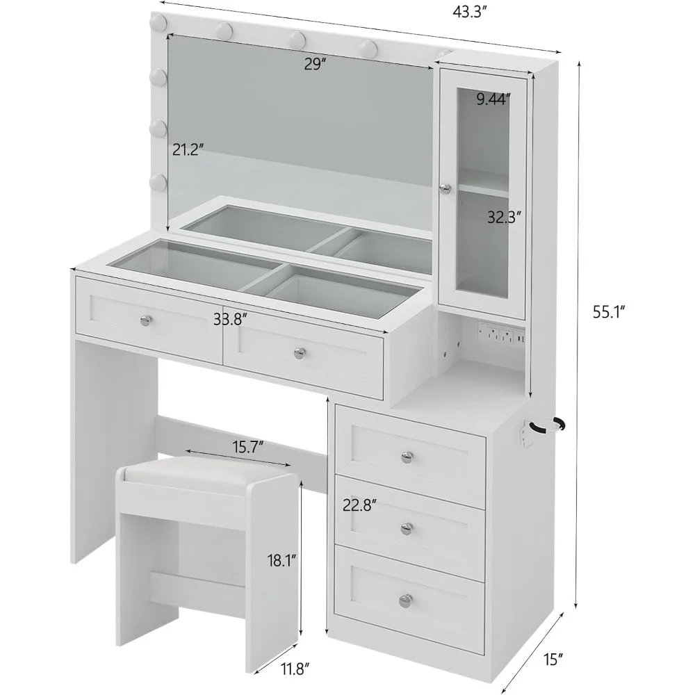 43" Vanity Desk with Mirror & 11 Lights / 5 Drawer Modern Makeup Desk with Glass top & Cushioned Stool / 3 Lighting Modes Bright