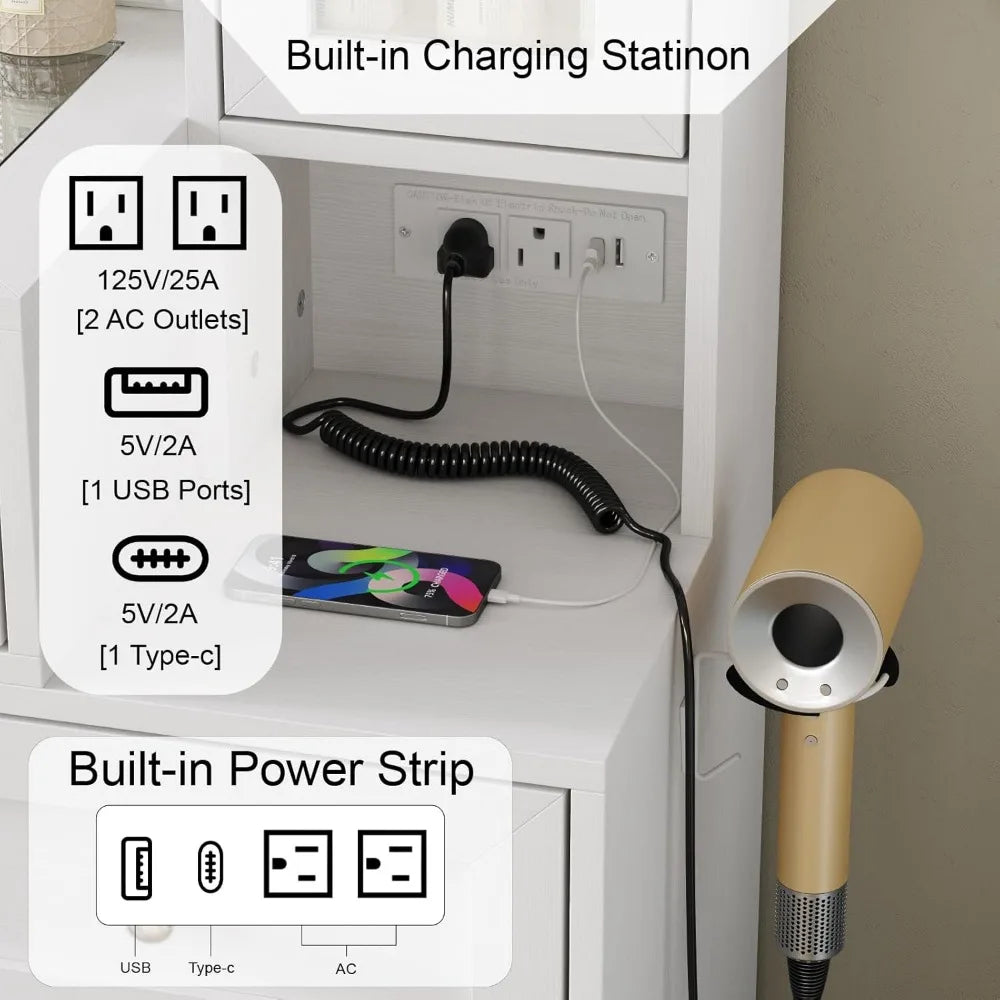 - Built-in Charging Station: Upgraded design! This vanity table now has 2 standard plug sockets and 1 USB port and 1 Type-C port charging station, so you can now charge your phone, computer and other electronic devices at the same time, you enjoy the entertainment or the blogs of the makeup bloggers while you do your skin care and makeup! You never need to worry again about your mobile devices getting low batteries or running totally out of power!