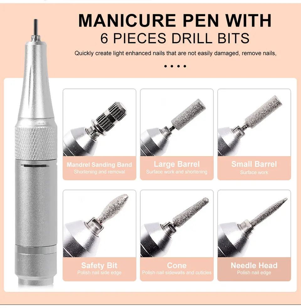 MULTIFUNCTIONAL NAIL DIAMOND SET: This professional nail art drill set contains 6 different nail art drills and 6 sanding strips, which can satisfy your manicure and pedicure needs in many ways, including trimming, sanding, engraving, cutting, polishing various nail art patterns and removing cuticles. This manicure set can be used in professional nail salons or DIY at home with your friends to enjoy the fun of nail art.