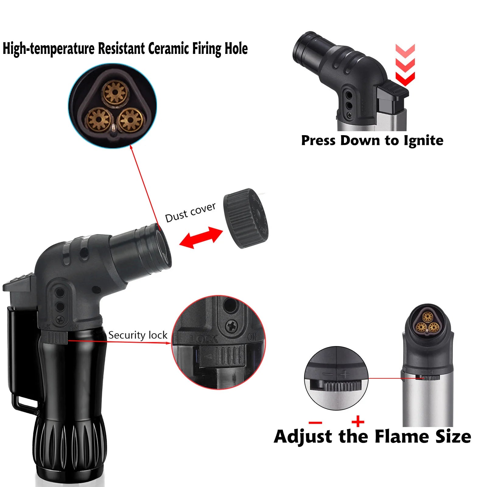 Powerful Triple Flames: Boasting a remarkable triple-jet design, this lighter delivers high-temperature, robust flames, ensuring effortless ignition for campfires, outdoor stoves, barbecues, or wilderness fire-starting. The combination of three flames makes lighting up a breeze.