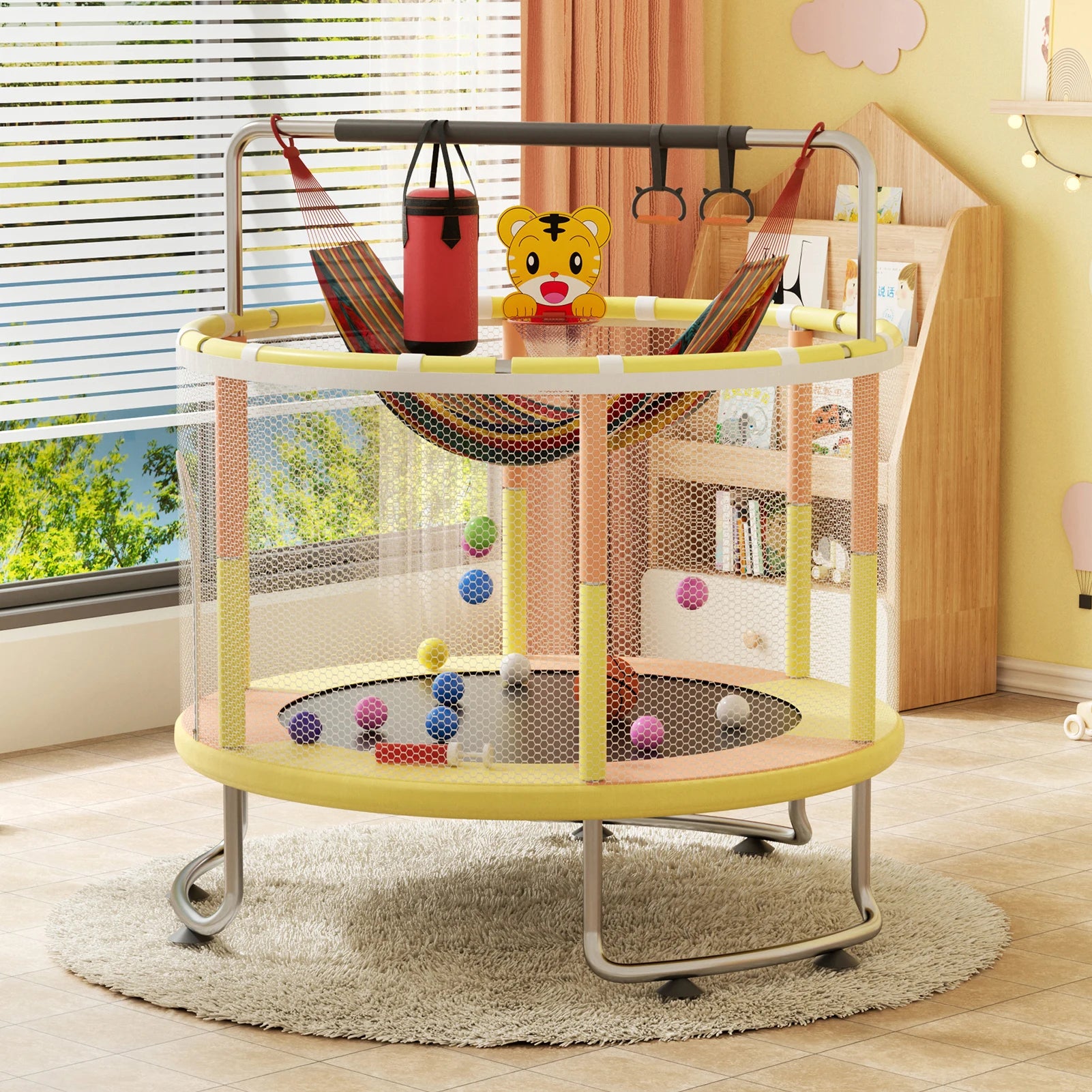 1 Metal 5FT Kids Trampoline, Adjustable Baby Toddler Trampoline with Basketball Hoop, Swing, Sandbag, Ocean Balls, High Bounce Cloth