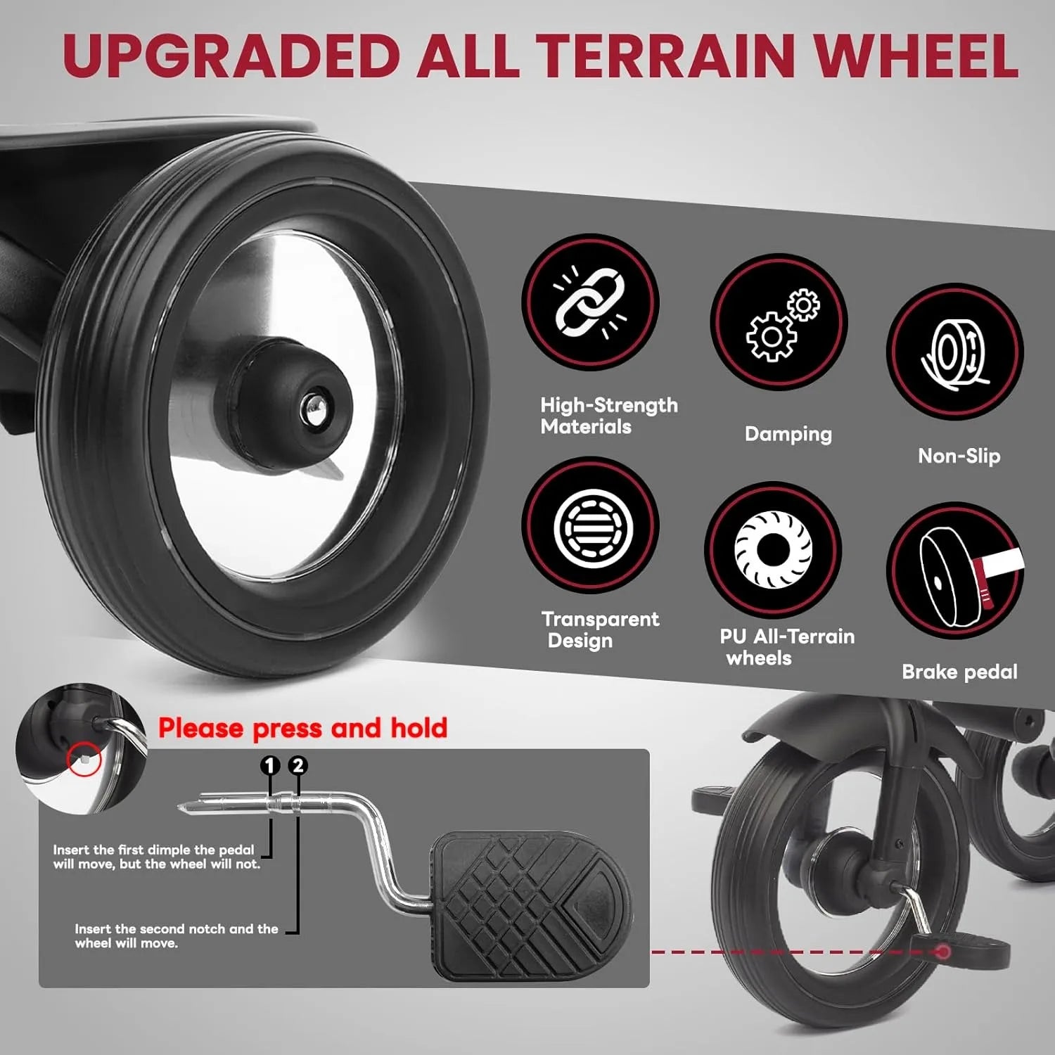7 TRICYCLES IN 1: Baby stroller-tricycle grows with your toddler through different riding stages. Easily convert between 7 growing stages by removing the accessories. Stroller- push tricycle-toddler tricycle-steering tricycle-training tricycle-standard tricycle, etc. -