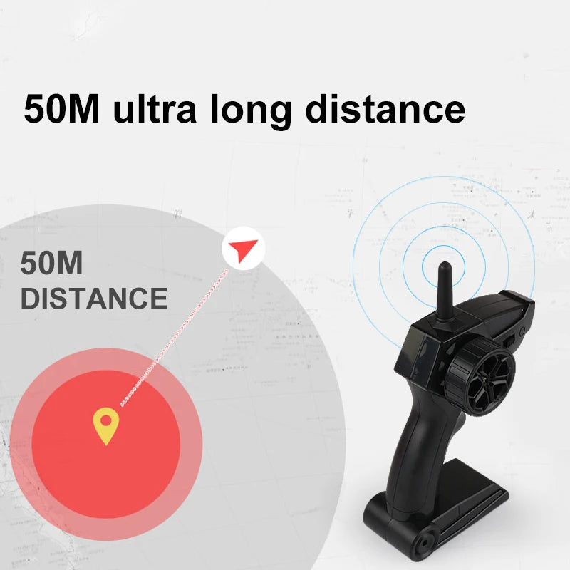 The remote control adopts a 2.4G high-frequency signal with a distance of up to 50 meters and strong anti-interference capabilities, suitable for multi-player competitions.