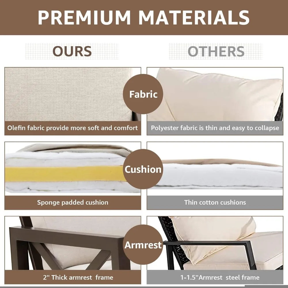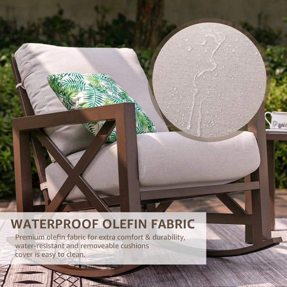 - Exceptional Durability & All Weather: Set includes 2 rocking chairs with padded cushions and 1 metal table. Anti-rust powder-coated steel frame for rocking chairs and metal table. Waterproof, weather-resistant fabric cushions have good strength and stability. Patio Furniture Set is UV and rust protected. Unique frame reinforcement / Weighted design offers stability. The weight-bearing capacity is better than other Rocking Chairs Patio Bistro Sets.