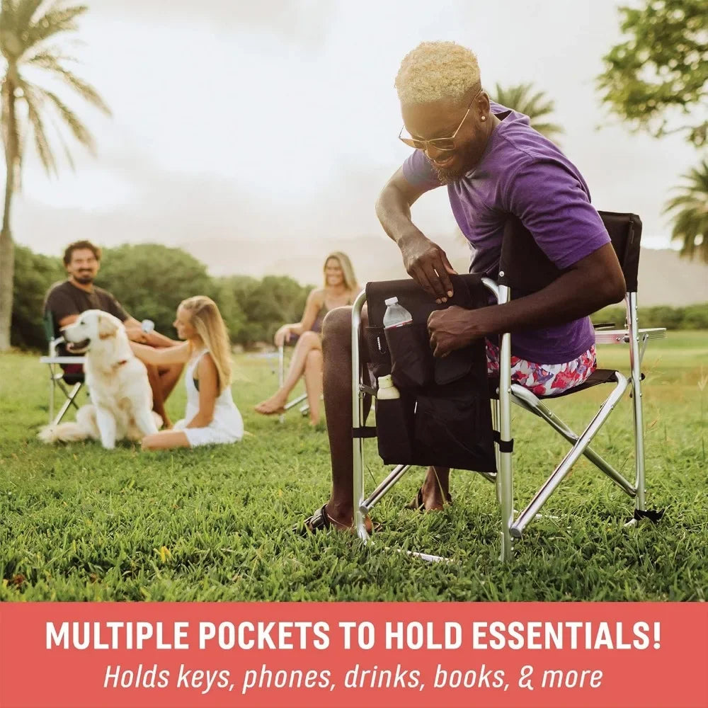 FEATURES GALORE: The accessories panel on this picnic chair and camping chair offers a variety of pockets to hold personal items, an insulated bottled beverage pouch, zippered security pocket, and a sturdy side table that folds out.