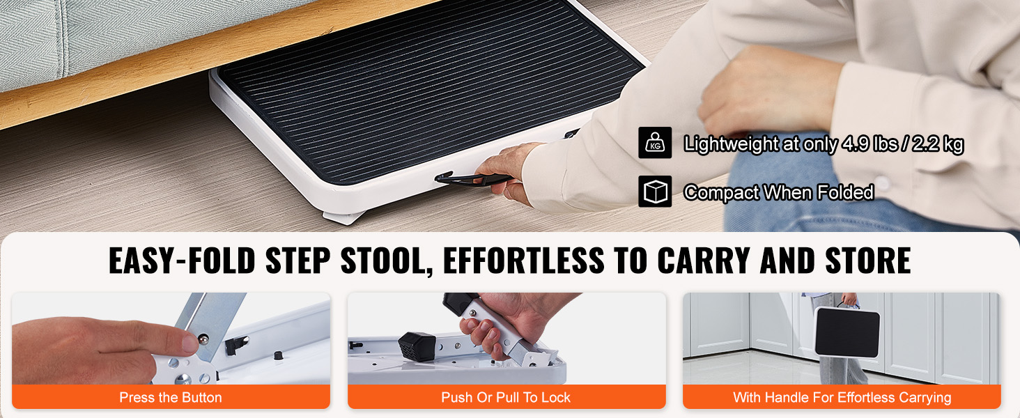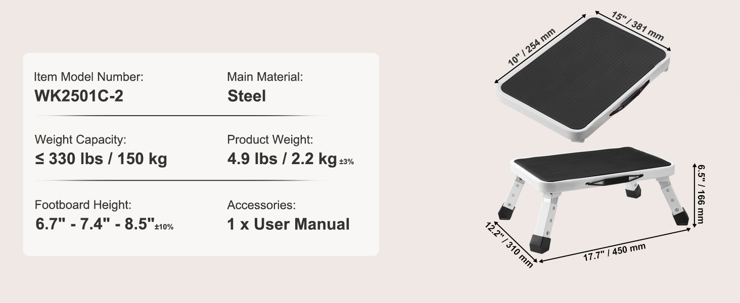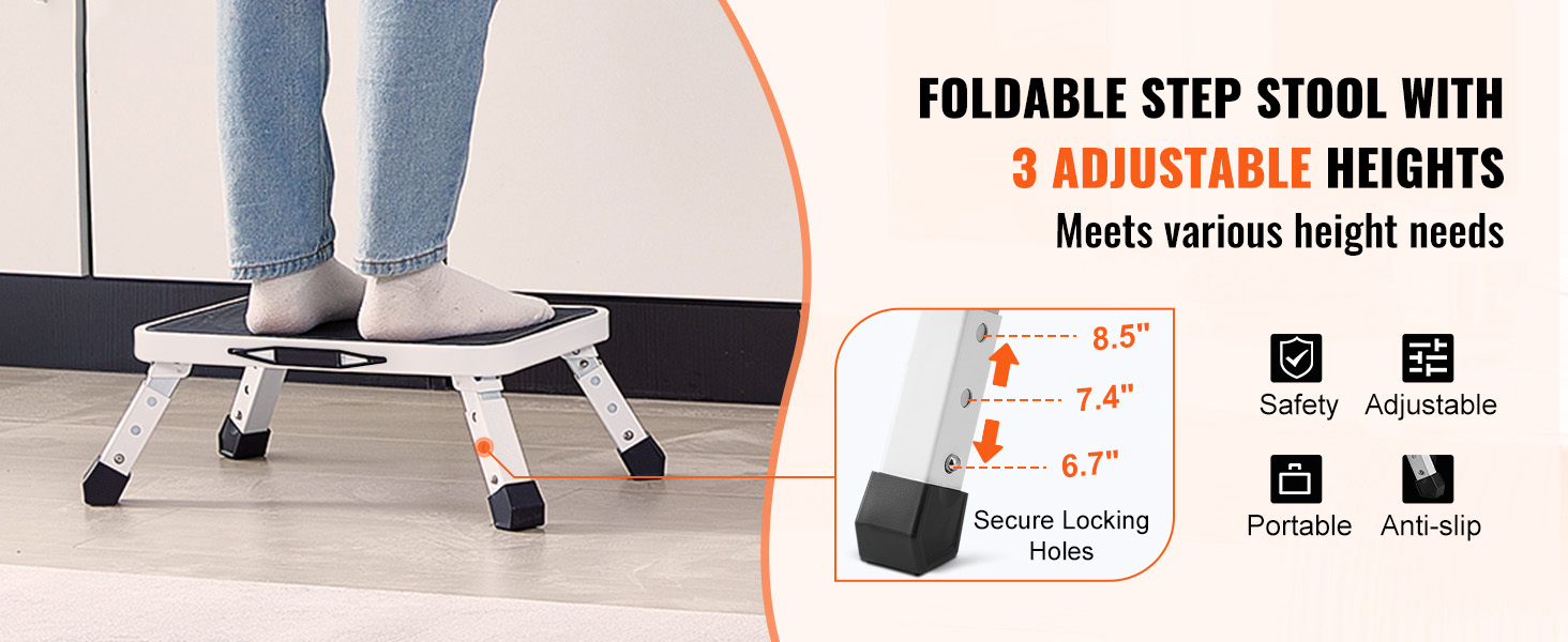 Three-Height Adjustability:This foldable step stool offers three adjustable heights, providing options of 6.7", 7.4", and 8.5" to accommodate various needs.