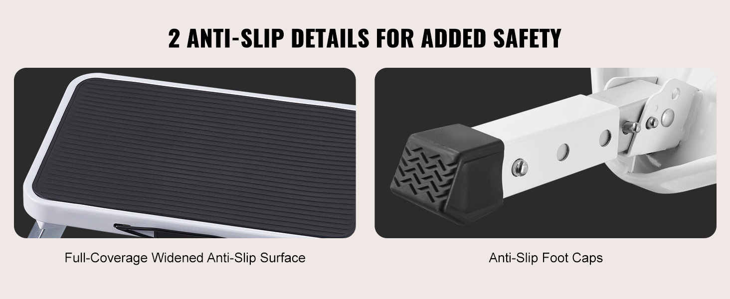 Safety Features:Designed with user safety in mind, the steel step stool includes a wide anti-slip surface and non-slip foot caps, providing reliable traction even on wet or slippery surfaces.
